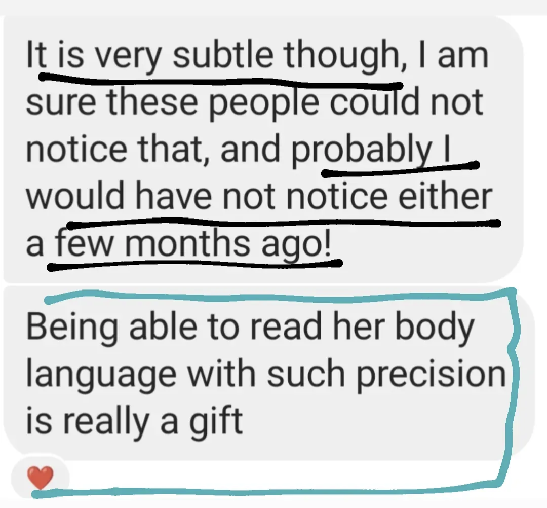 [Our] Communication has improved a lot! I am able to understand Vee with precision, which really helps me in preventing problems. I think she also feels more confident because she knows how she can ask things from me.